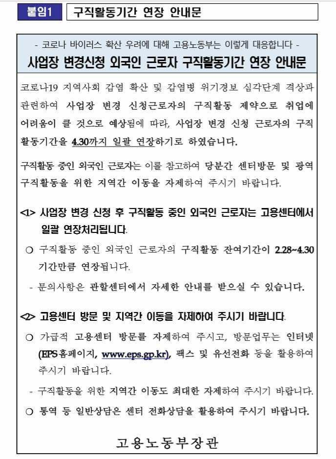 코로나 바이러스 유행으로 고용허가제 외국인노동자 구직활동기간 연장 안내