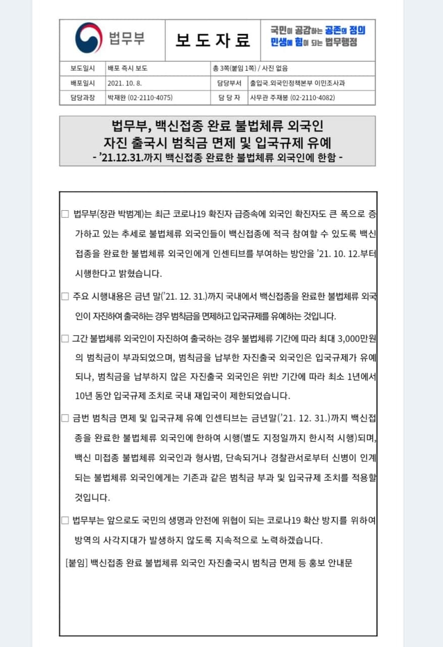 법무부,백신접종완료 불법체류외국인 자진출국시 범칙금면제 등(2021.10.10)