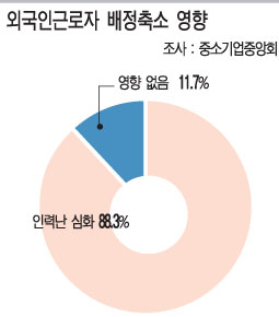 조사에서 실제 응답업체 중 88.3%가 올해 신규외국인근로자 고용한도가 줄어드는 바람에 업체의 인력난이 심화됐다고 응답했다. 이중 41.4%는 인력난이 매우 심각한 것으로 답해 신규외국인근로자 고용한도 축소가 중소제조업에의 인력수급에 미치는 파급이 매우 큰 것으로 나타났다.