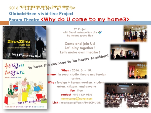 본 프로젝트 참여자는 워크샵 과정을 거쳐 무대에 배우로 참여할 수 있는 기회를 얻게 되며 소정의 교통비와 기념품을 드립니다. 2016년 대한민국 서울을 살아가는 외국인, 한국인들의 다양한 이야 기가 무대로 올려지는