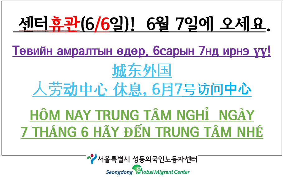 6월 6일 화요일은 센터가 쉽니다. 국가공휴일인 현충일입니다.